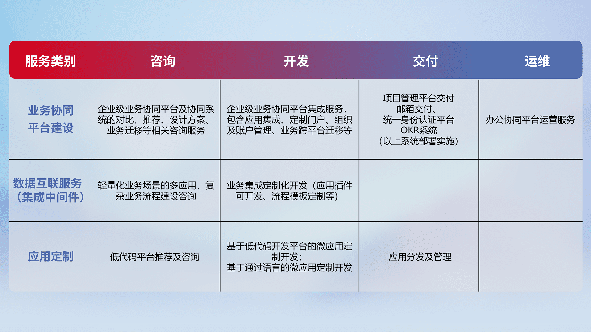 针对钉钉、、、企微、、、、IDaas等平台级产品提供产品的规划、、方案、、交付、、、、定制化开发等服务,,,,实现如统一协同办公、、、智能客户服务、、混合会议管理、、、智能数据查询、、等业务场景,,实现数字化转型。。。。